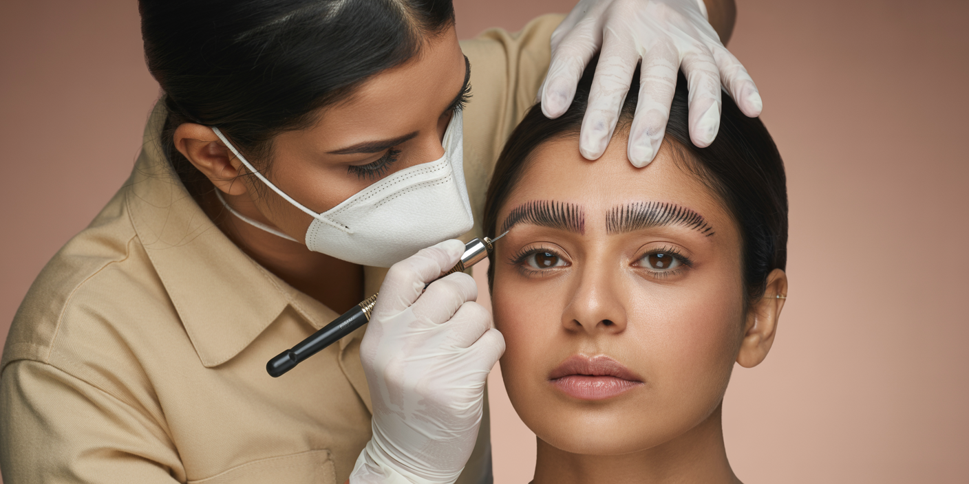 Tiny hair-like strokes are drawn on the brow area using a handheld tool. Pigment is deposited into the skin, mimicking natural hair for a defined, fuller look.
